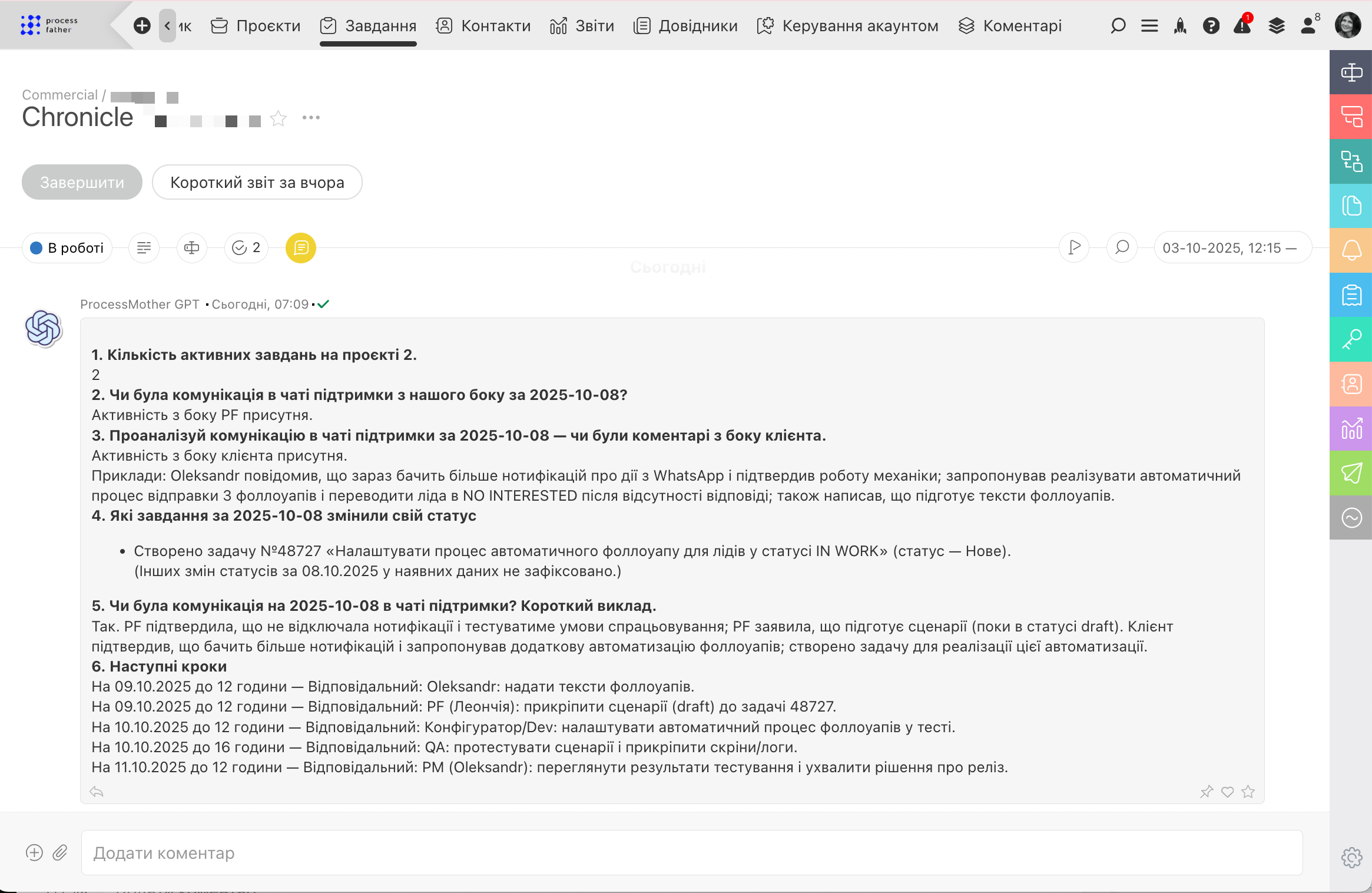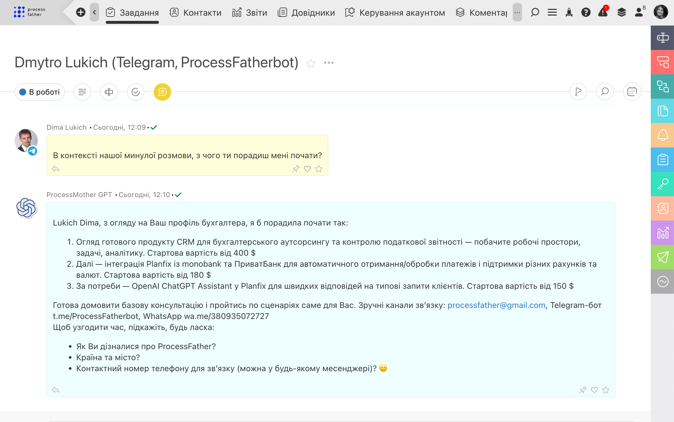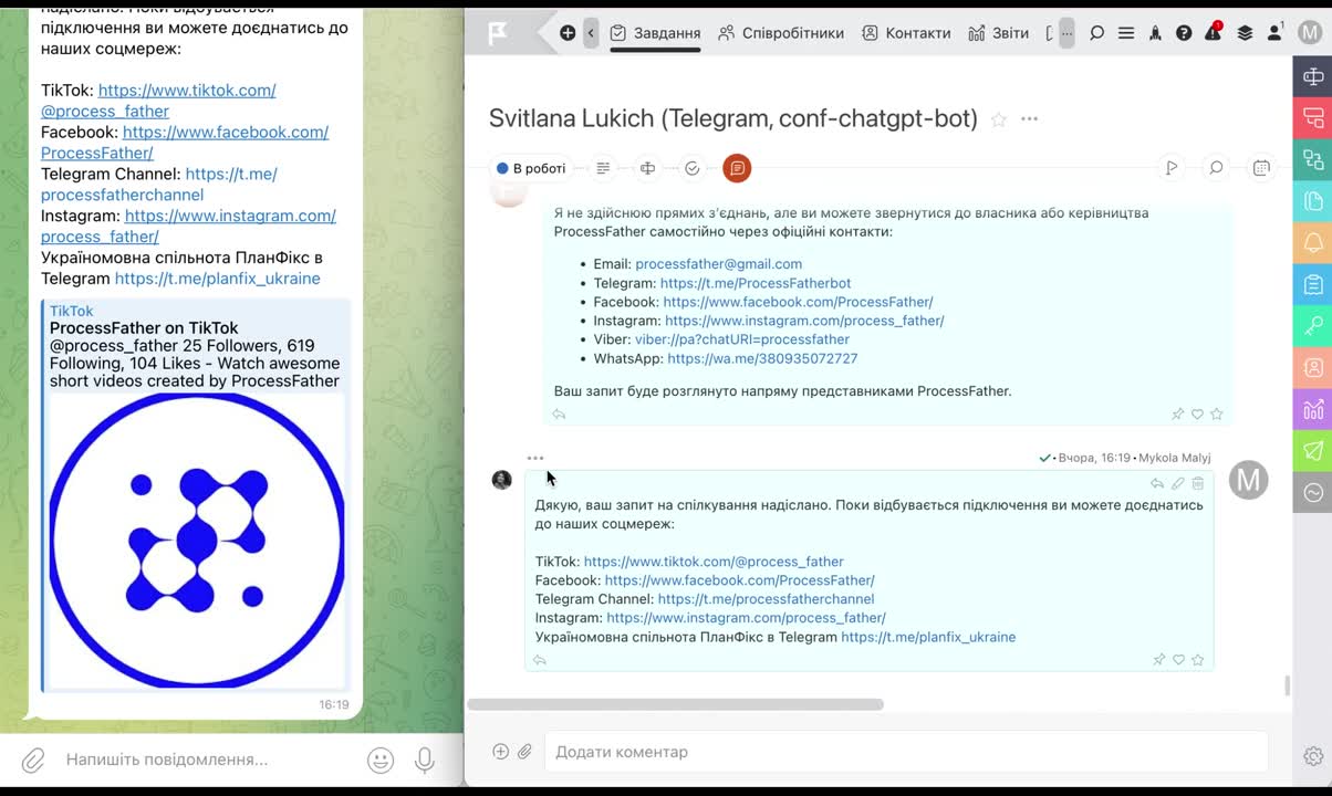 Тепер не так важливо, які саме канали комунікацій ви використовуєте — Facebook, Instagram, WhatsApp, Viber, Telegram чи електронну пошту. Ви можете спілкуватися з клієтами безпосередньо з ПланФікс. Де б вам не написав клієнт, ви побачите його повідомлення в Хроніці і зможете миттєво відповісти, а він отримає вашу відповідь там, де й почав спілкування. Не побачили у списку потрібної вам платформи? Просто повідомте це нам — у ПланФікс досить широкі можливості для інтеграції через відкриті API-методи, тому ми зможемо інтегрувати саме ту платформу, яка вам необхідна.