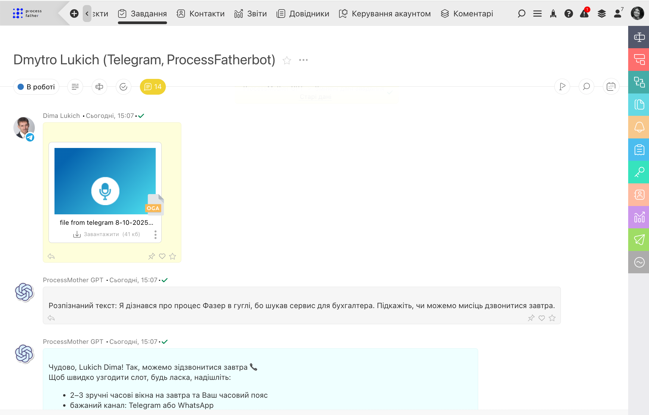 Усі діалоги з Instagram, Facebook Messenger, Telegram та чату на сайті обробляються в єдиному вікні CRM. AI-асистент може сортувати звернення, визначати їхню пріоритетність, фіксувати замовлення або заявки та передавати складні кейси менеджерам. Це гарантує, що жодне повідомлення не буде пропущене.